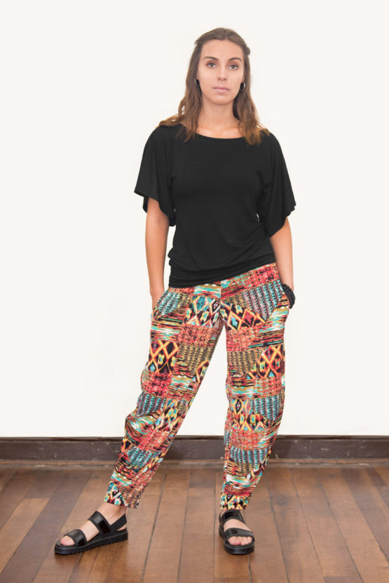 Pantalón bombacho sin puño, con bolsillos y pretina elasticada. En lycra estampado diseños rojizos. Talla S M L XL.
