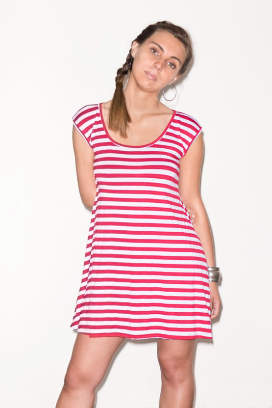 Vestido campana corto, manga corta y rallado, sin bolsillos en algodón modal listado, tallas S M L XL