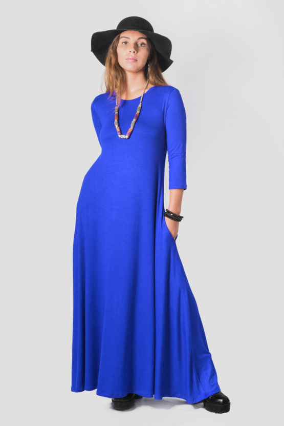 Vestido campana largo, manga 3/4, cuello cerrado y bolsillos. Tela algodón modal negra, rojo, azulino, azul, verde musgo y gris. Talla S M L XL.