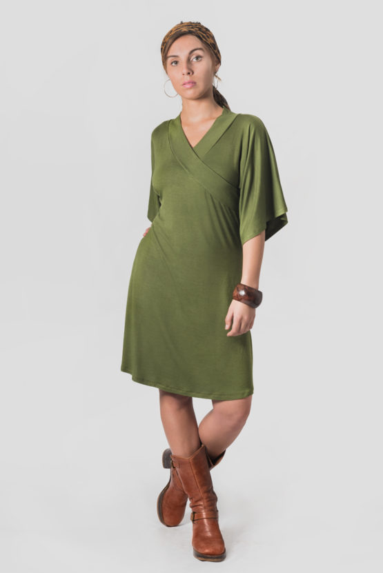 Vestido cruzado corte kimono midi y manga 3/4. En Algodón modal colores, negro, azulino, rojo, verde musgo y gris. Talla S M L XL.