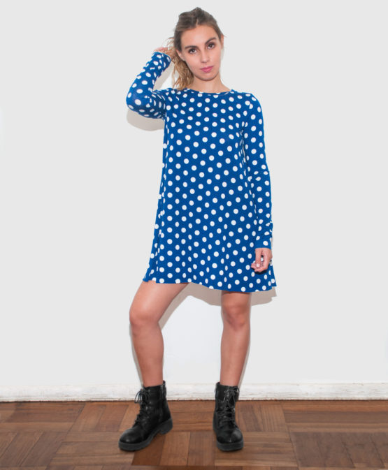Vestido de invierno corto, corte campana , con grandes lunares blancos sobre azulino. Escote cerrado y manga larga ajustada