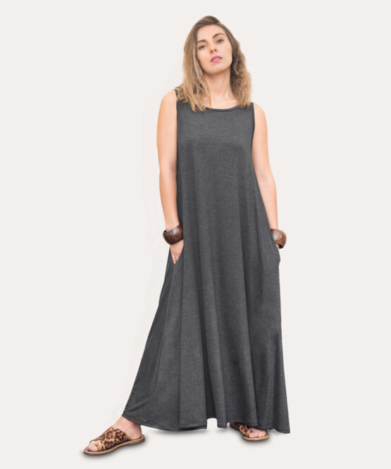 Vestido largo campana, cuello bote, sin mangas y bolsillo. En algodón modal. Tallas S M L XL.
