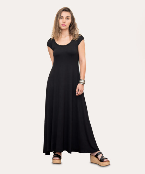 Vestido largo evasé, escote redondo y manguitas. En algodón modal. tallas S M L XL.