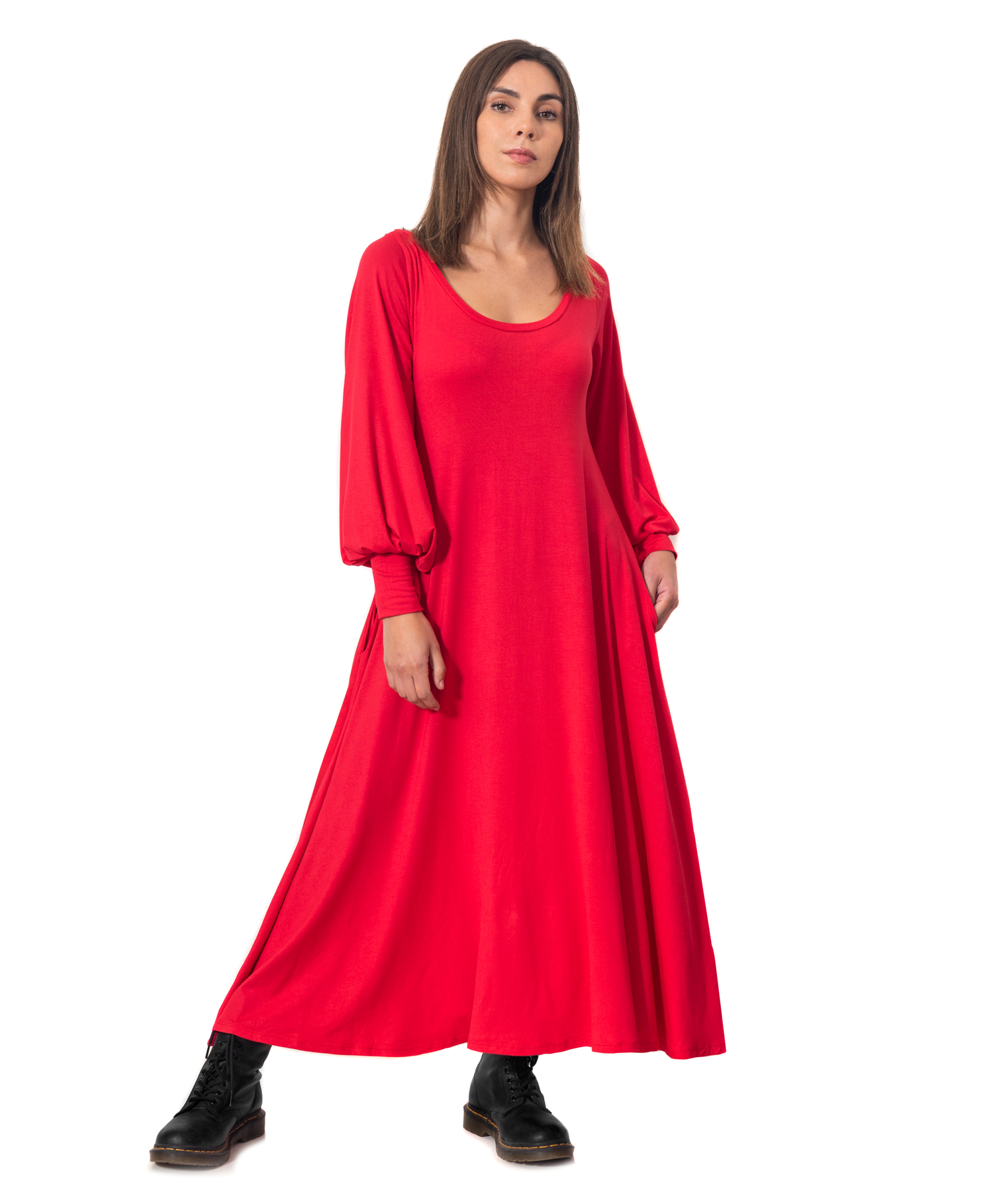 Vestido largo ebase, escote redondo, bolsillos y manga globo.