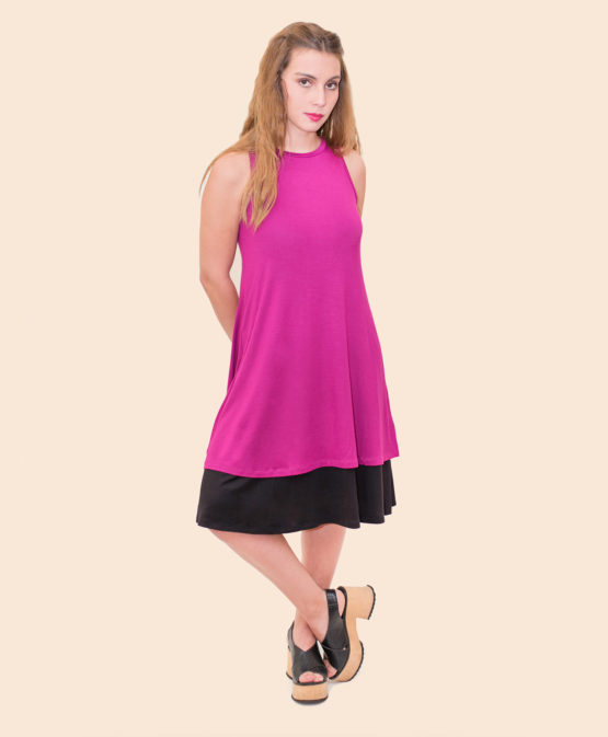 Vestido midi doble sin hombros corte evase, en algodón modal fucsia con negro, tallas S M L XL.