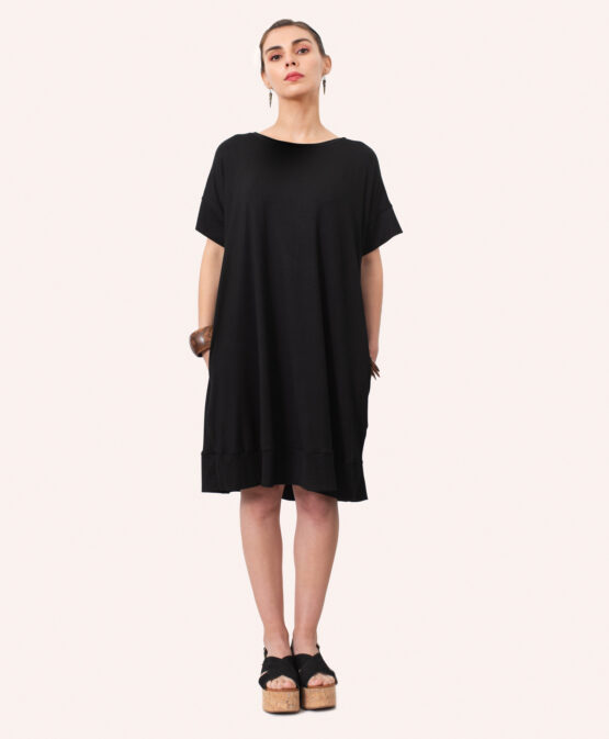 Vestido holgado midi con pretina ancha y manga corta con puño ancho. En algodon modal.