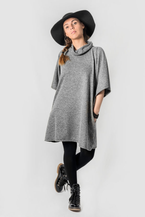 Vestido corte túnica, manga amplia cuello Beatle y bolsillos. Tela de punto grueso gris. Talla S M L XL.