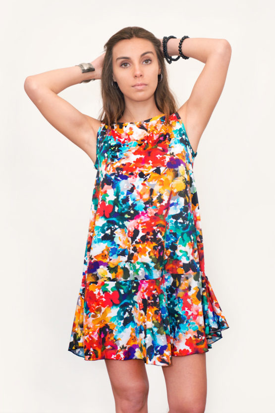 Vestido ancho, corto con volante en el ruedo y sin mangas. En lycra estampado floreado colores. Talla S M L XL.